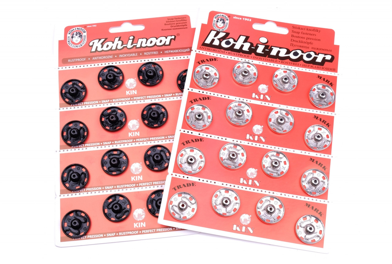 Stiskací knoflík se skládá ze dvou částí. Na látku se knoflík připevňuje přišitím. Baleno po 5 kartách. Na jedné kartě je 16 kinů. Kvalitní český výrobek.