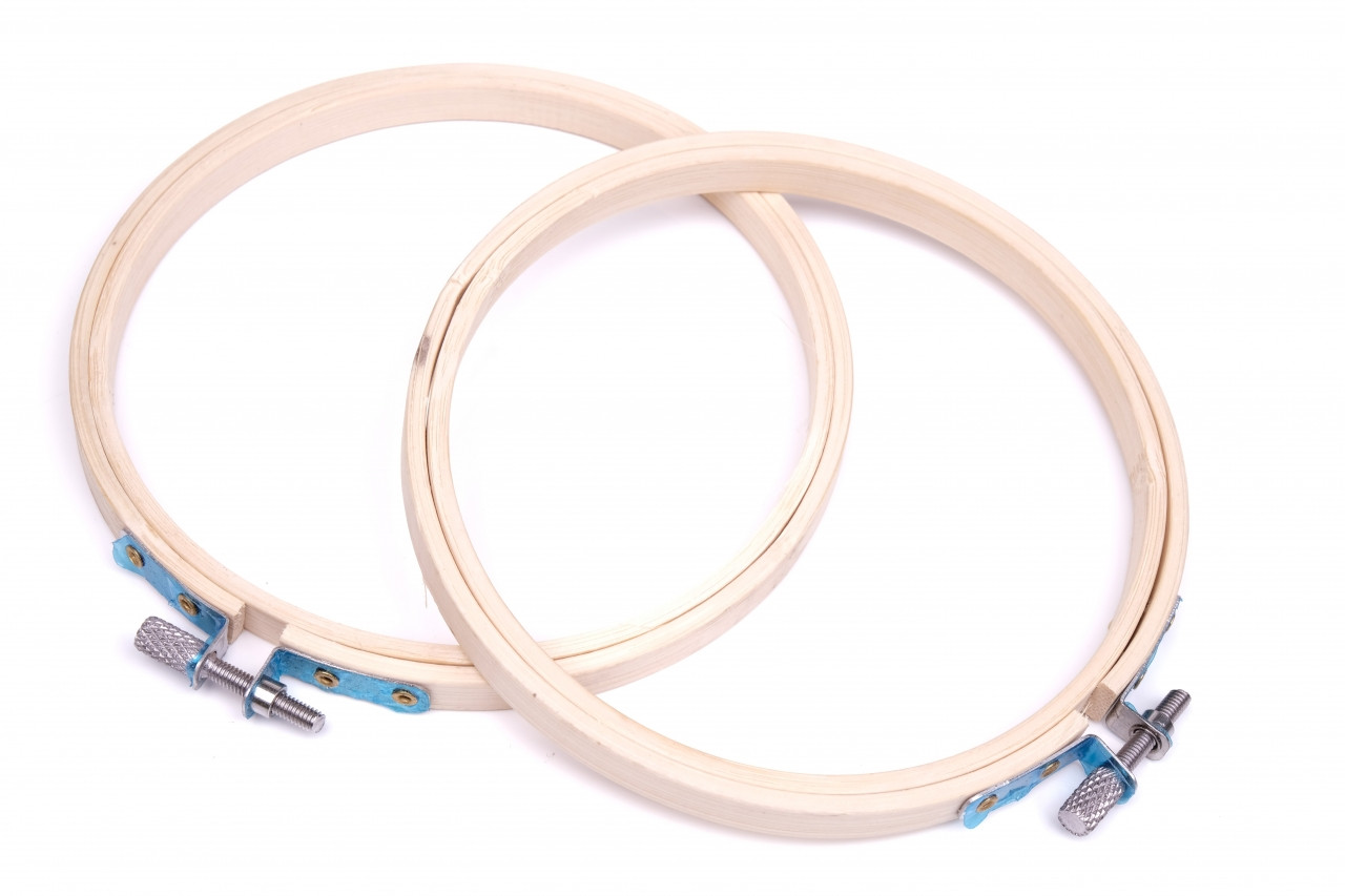 Dřevěný kroužek na vyšívací tkaniny s kovovým stahovacím šroubkem.