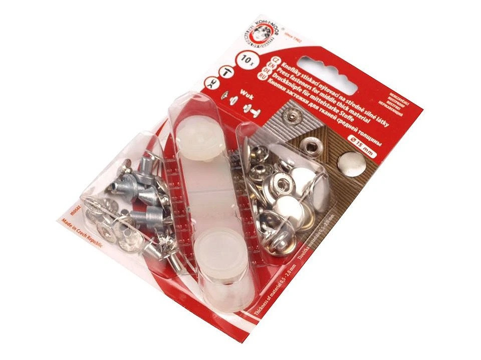 Knoflíky stiskací nýtovací na silné látky velikost 15mm nerezavějící, balené na kartě po 10ks včetně nýtovacího přípravku. Stiskací knoflík druh  WUK