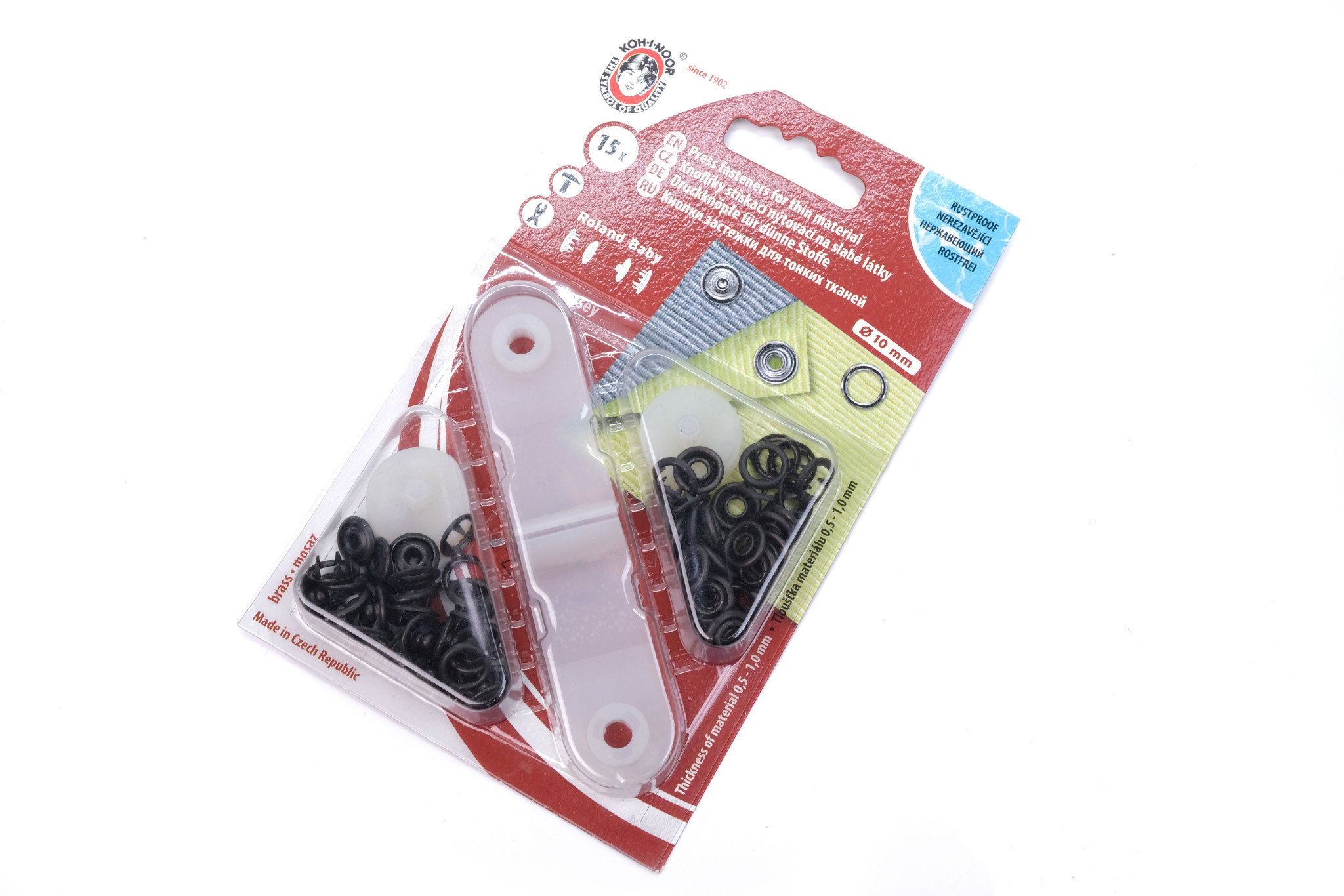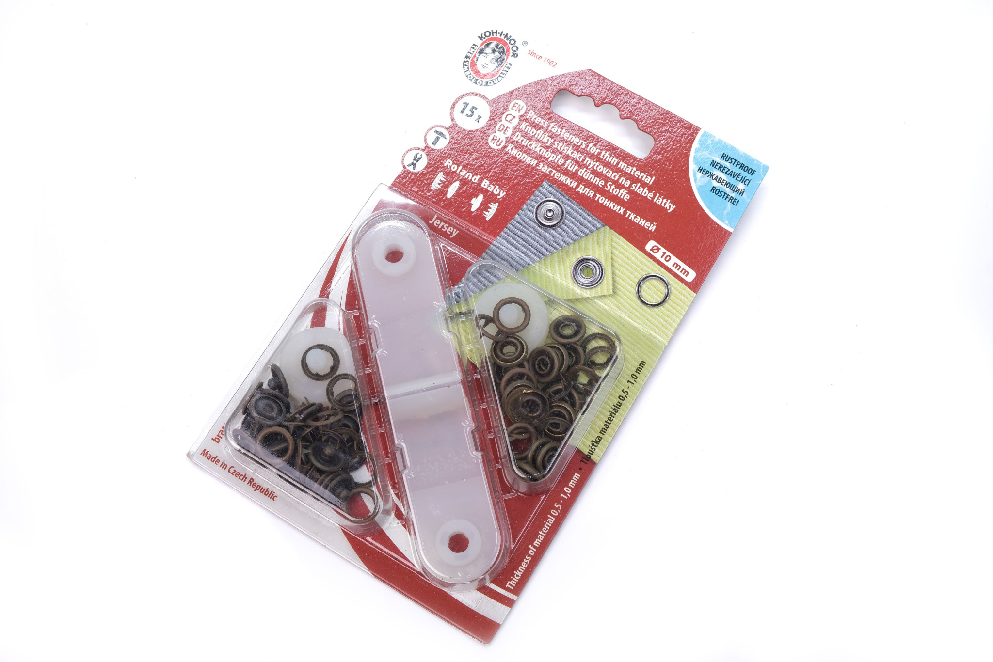 Stiskací knoflíky se využívají ke spojování jemných, slabých a poddajných druhů látek - froté, úplet, košilovina apod. Součásti balení je mini lis, se kterým se provádí nýtování knoflíků.