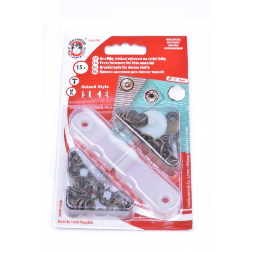 Stiskací knoflíky se využívají ke spojování jemných, slabých a poddajných druhů látek - froté, úplet, košilovina apod. Součásti balení je mini lis, se kterým se provádí nýtování knoflíků.