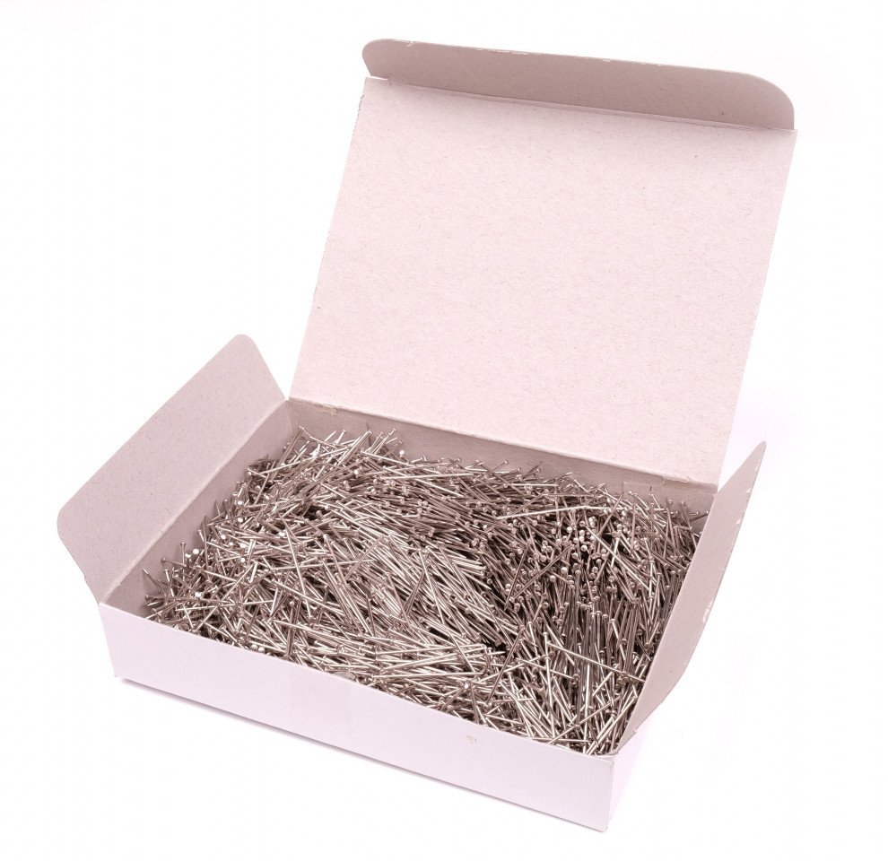 Špendlíky celokovové 101, v papírové krabičce, balení po 500g, délka 22mm, průměr drátu 0,80mm, průměr hlavičky 1,60mm, počet kusů v krabičce cca 6700 ks.