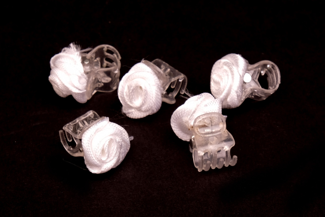Skřipec nebo malá sponka s textilní růžičkou. Jsou vhodné pro všechny slavnostní události, především pak k ozdobení účesu jak nevěsty i pro družičky. Velikost růžičky je 15mm.