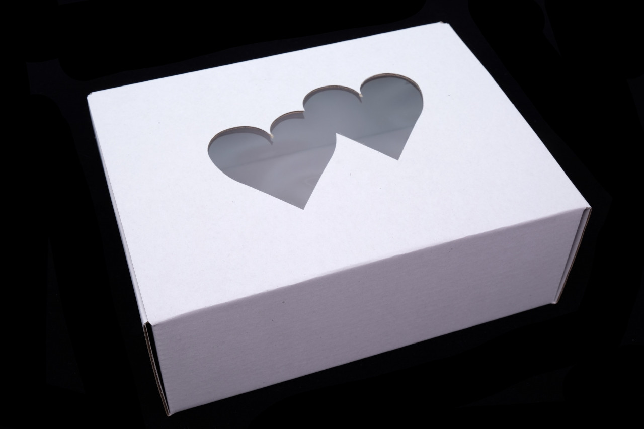 Papírová krabice má ve víku výřez ve tvaru dvou srdcí. Krabici využijete na balení dárků, šátků, svatební výslužky apod. Můžete si ji i dozdobit podle svého vkusu. Určeno pro sekundární styk s potravinou. Krabici dodáváme v rozloženém stavu. Složíte si ji jednoduše podle vyznačených ohýbacích krajů.