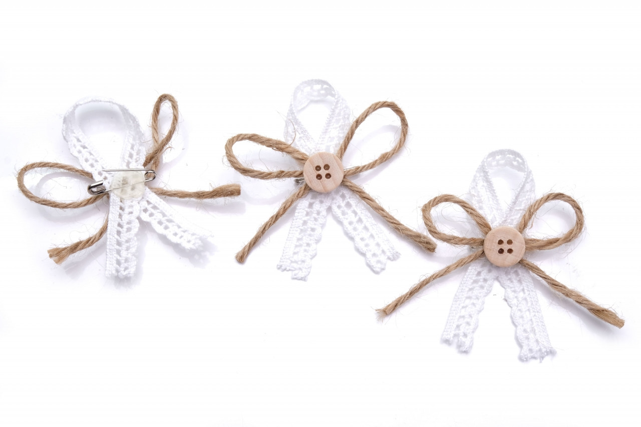 Krásné svatební mašličky s bavlněnou krajkou a jutovou šnůrkou a dřevěným knoflíkem v rustikálním stylu na přírodní svatbu.