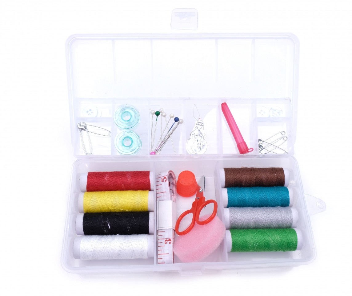 1x metr, 6x spínací špendlík, 1x navlékač, 1x náprstek, 6x jehel, 8x špulky nitíí, 1x jehelníček 9x špendlík, 4x knoflík, 2x špulka, 1x mini nůžky