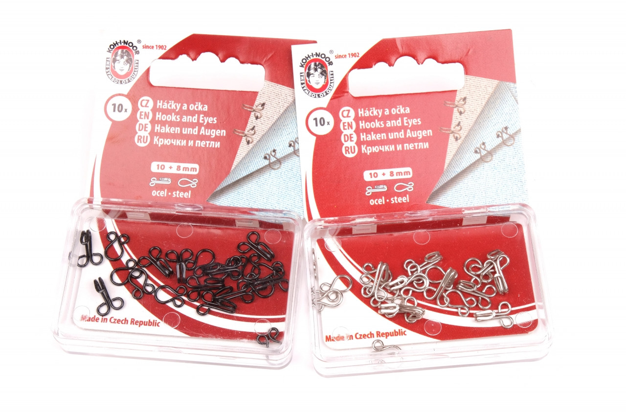 Tradiční háček a očko, vhodné pro oděvy. V balení 10 párů, délka háčku 10mm, délka očka 8mm.