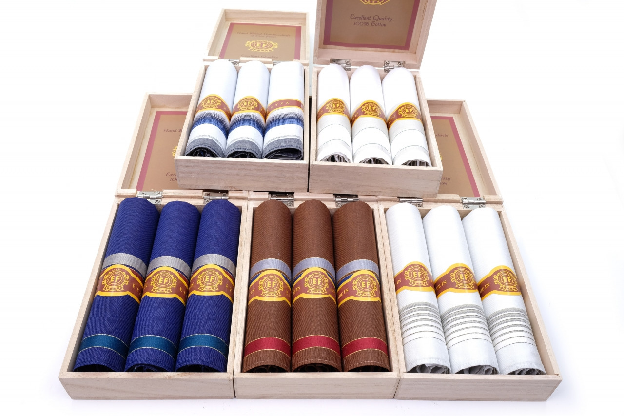 Dřevěná krabička obsahuje 3 kapesníky zabelené jako doutník v krabičce