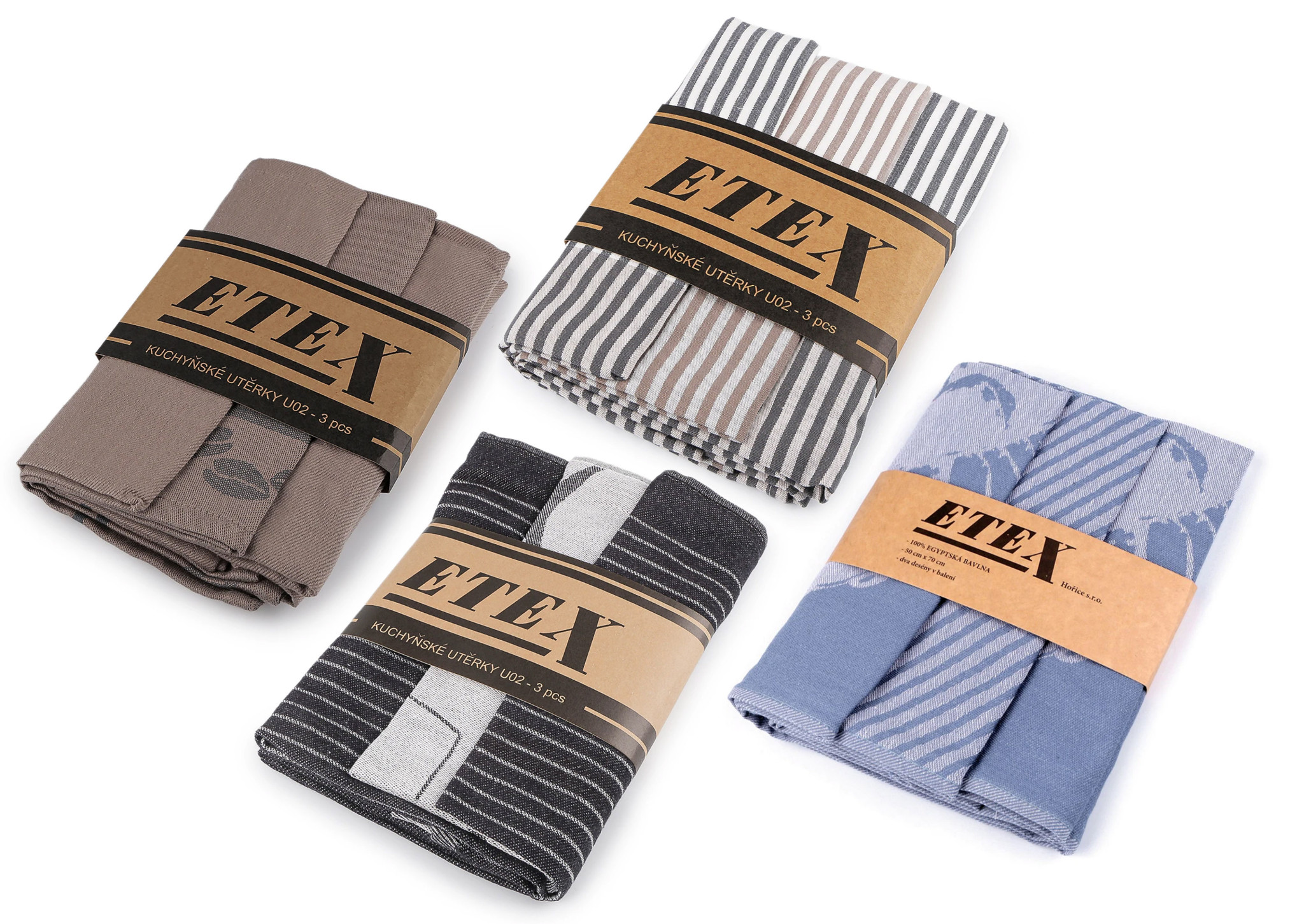 Kvalitní utěrky jsou vyrobené z egyptské bavlny, která je považována za nejkvalitnější bavlnu na světě. Utěrky jsou extrémně savé, stálobarevné, hebké, bez žmolků a mají dlouhou životnost. Díky poutku je můžete pohodlně zavěsit.