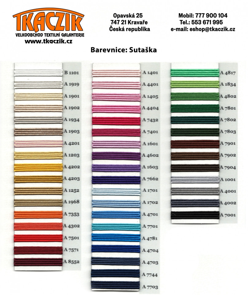 Sutaška je splétaný uzký prýmek. Vyrobený ze 100% viskózy. Výrobek je v různých barvách.