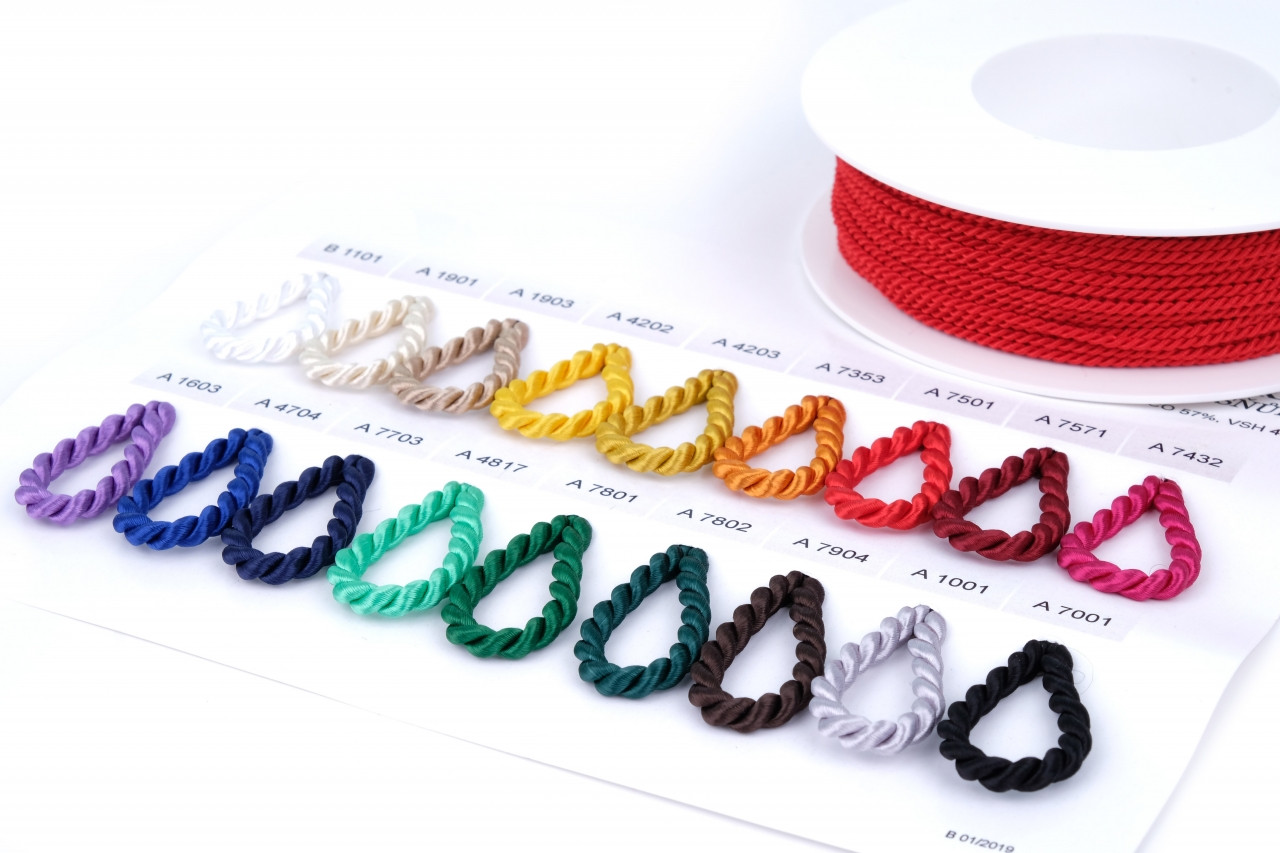 Kroucená šnůra je pevná a má lesklý povrch. Šíře šnůry je 2mm. Lze využít jako dekorace, v textilní galanterii nebo také na originální zabalení dárku. Skladem máme více barev.