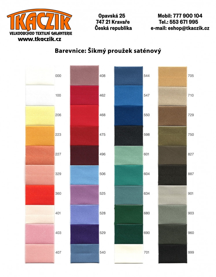 Šikmý proužek atlasový nebo taky saténový je zakládaný do středu, rovnoměrně z obou stran. Je vhodný k olemování lehké dámské konfekce a jemného bytového textilu. Alternativní název: šikmý proužek barevný, šikmá stuha zakládaná doprostřed, ozdobná lemovka, ozdobná lemovka lesklá.