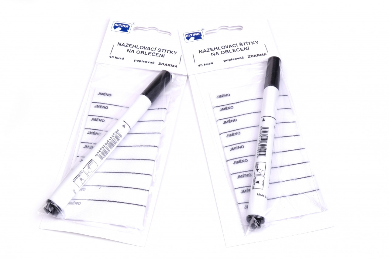 Balení obsahuje 45 ks nažehlovacích štítků na oblečení + 1 popisovač. Hlavní využití je nejen v jeslích, mateřských školkách, školách, dětských domovech a nemocnicích. Na štítky lze psát tužkou na textil. Nažehlovací štítky je možné prát v pračce při teplotě nejvýše 60°C.