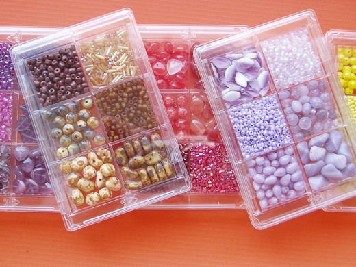 Skleněné korálky náhodný mix barev nadružené v různých velikostech, druzích a barvách v plastové krabičce se šesti zásobníky, váha obsahu cca 80 g. Nevhodné pro děti do 6 let. Alternativní název: skleněné korálky, skleněné perličky, mačkané korálky.