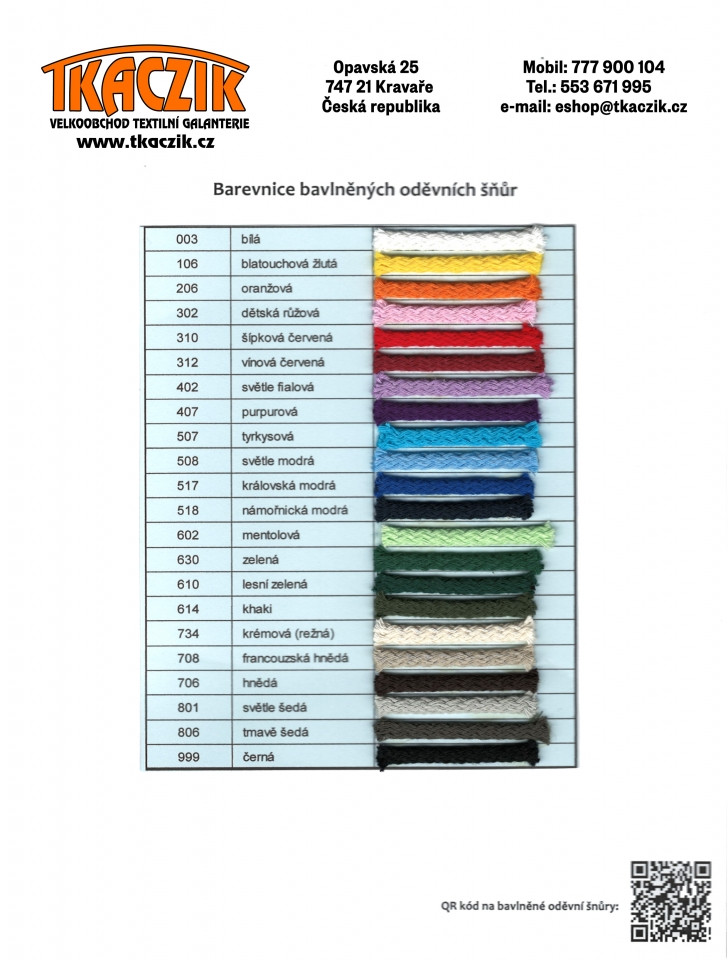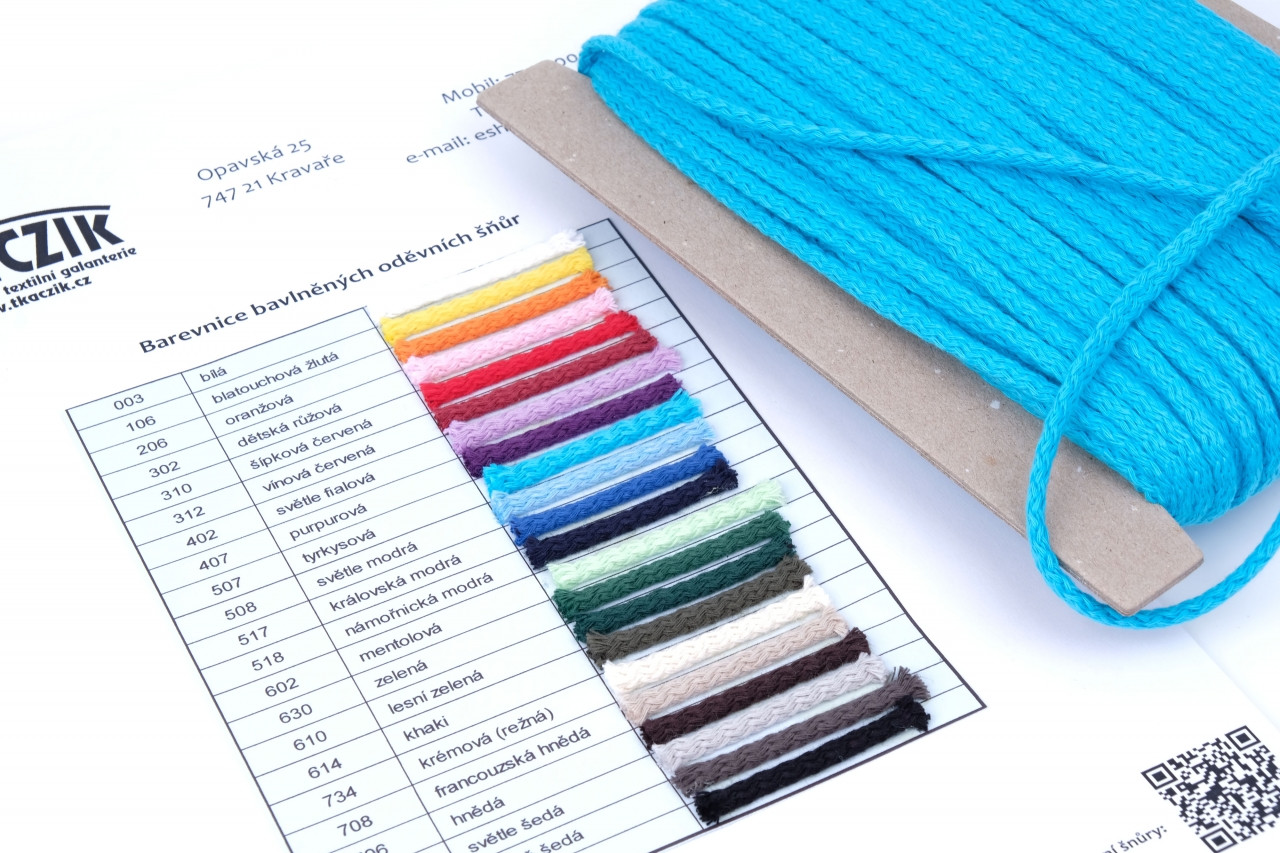Šňůra oděvní je vhodná do tunýlků bund, tepláků a jiných oděvů. Lze ji také využít jako vázačku na bytové textilie například polštáře. Alternativní název: šňůrka, provaz, provázek, vázačka...