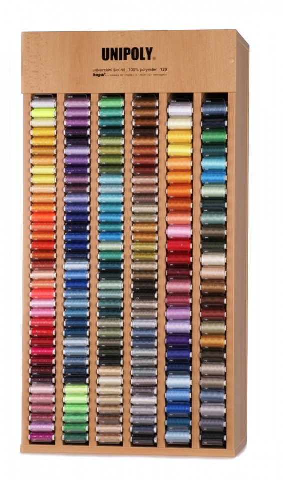 Stojan nabízíme k zapůjčení zdarma, účtuje se pouze náplň. Stojan obsahuje 194 barev tj. 1440 cívek nití 100m a 500 cívek nití 500m.