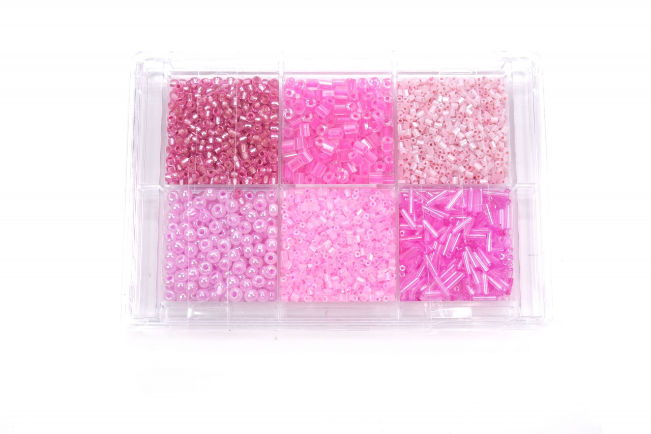 Skleněné korálky nadružené v různých velikostech, druzích a barvách v plastové krabičce se šesti zásobníky, váha obsahu cca 80 g. Nevhodné pro děti do 6 let. Alternativní název: skleněné korálky, skleněné perličky, mačkané korálky.