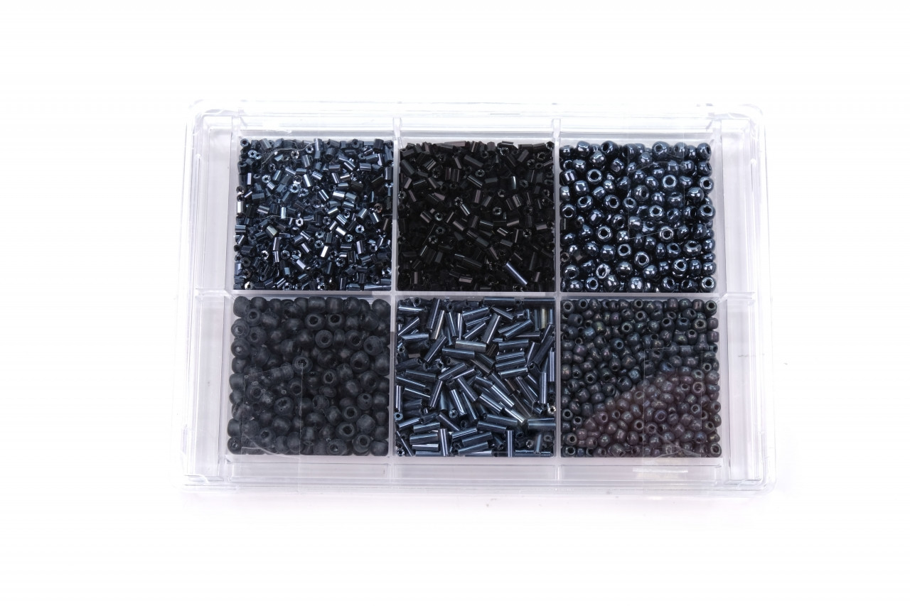 Skleněné korálky nadružené v různých velikostech, druzích a barvách v plastové krabičce se šesti zásobníky, váha obsahu cca 80 g. Nevhodné pro děti do 6 let. Alternativní název: skleněné korálky, skleněné perličky, mačkané korálky.