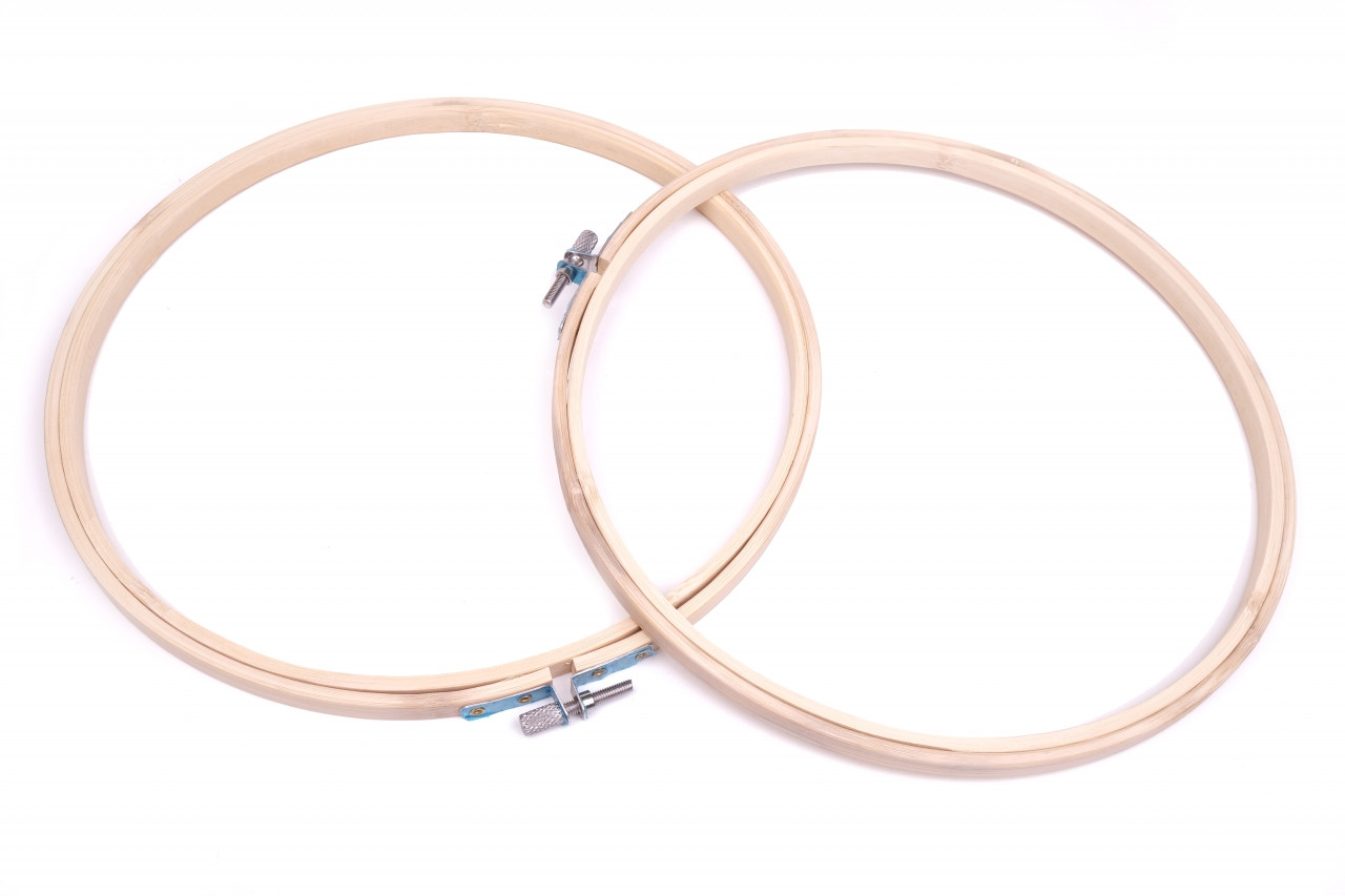 Dřevěný kroužek na vyšívací tkaniny s kovovým stahovacím šroubkem.